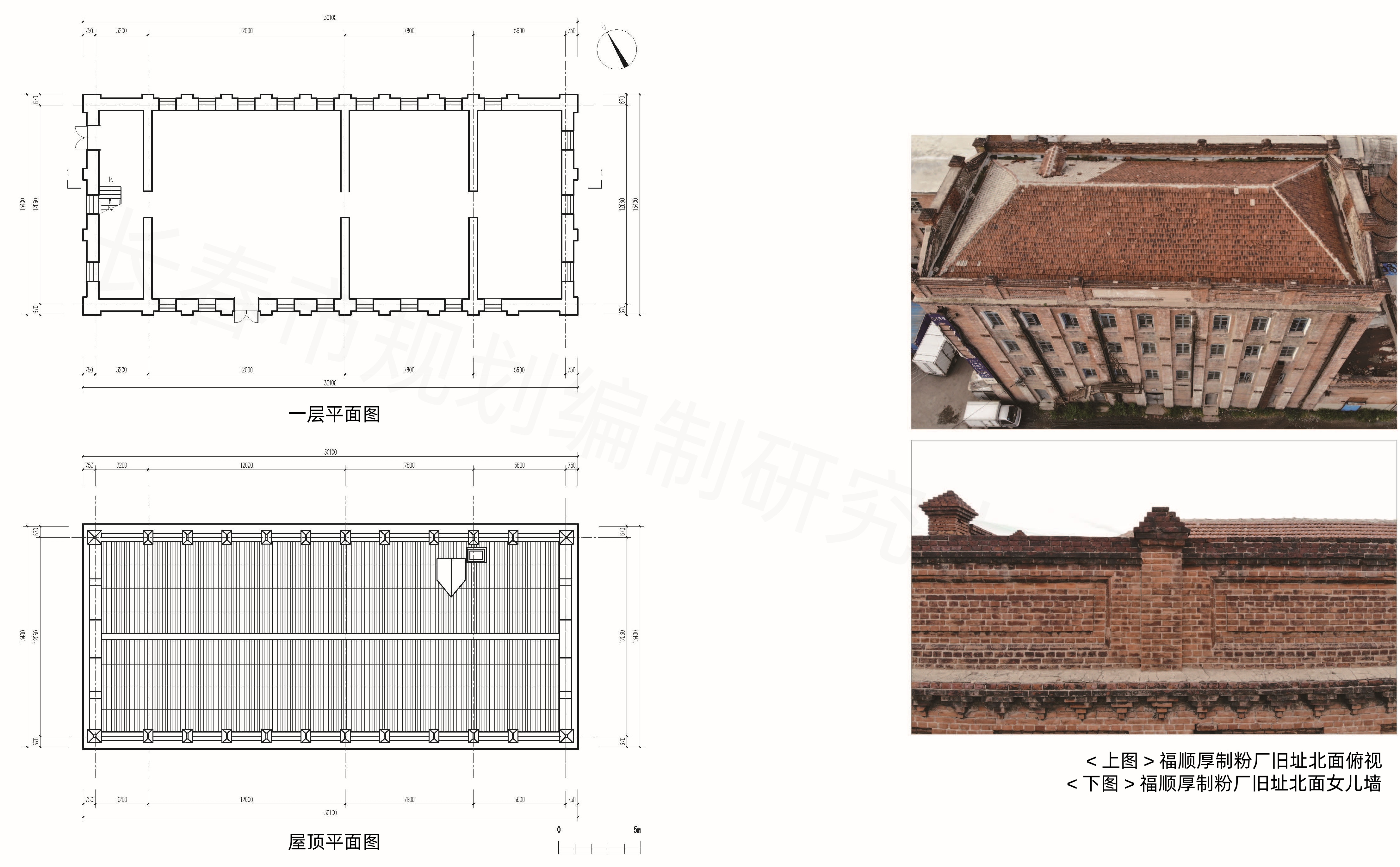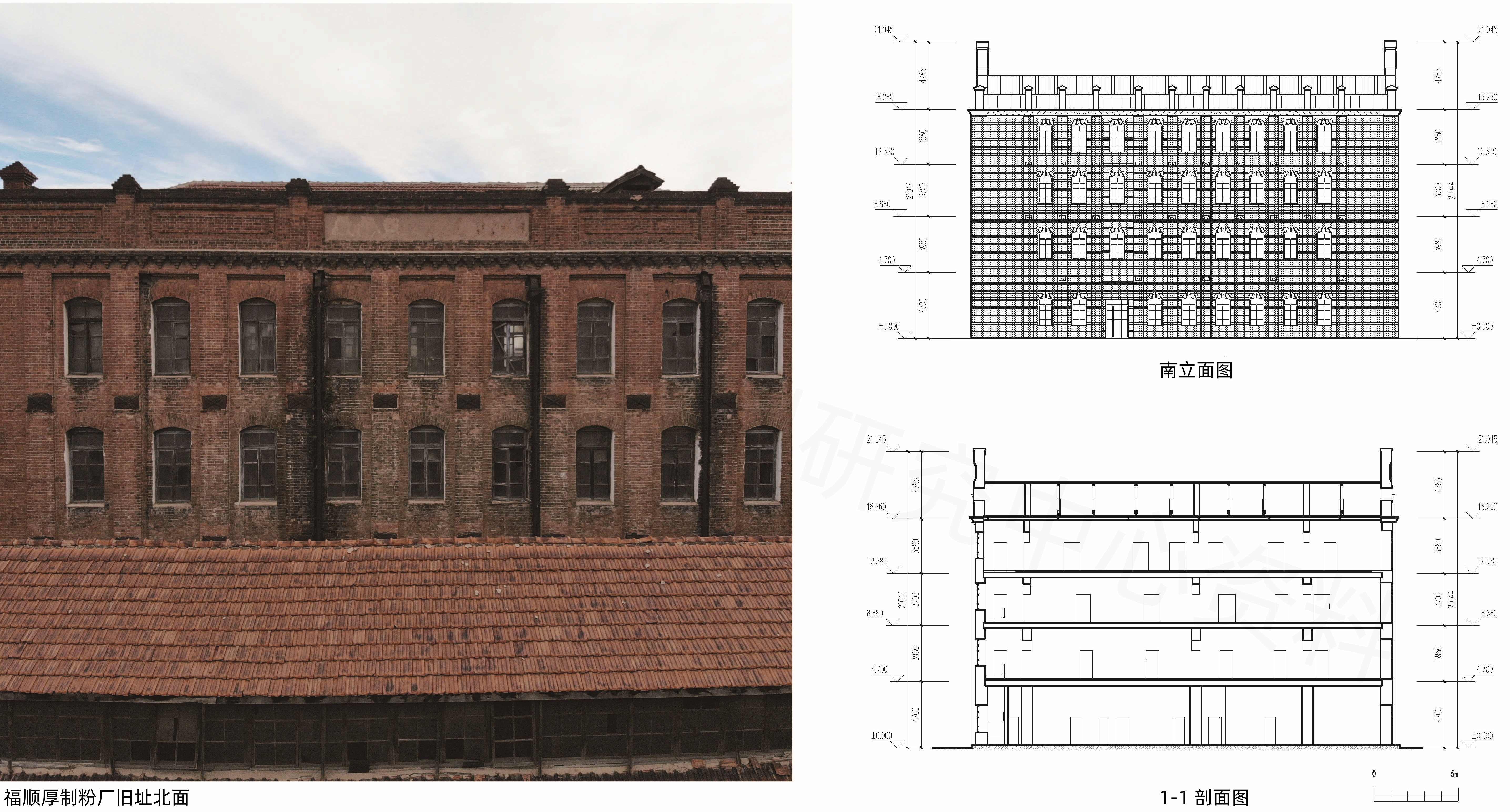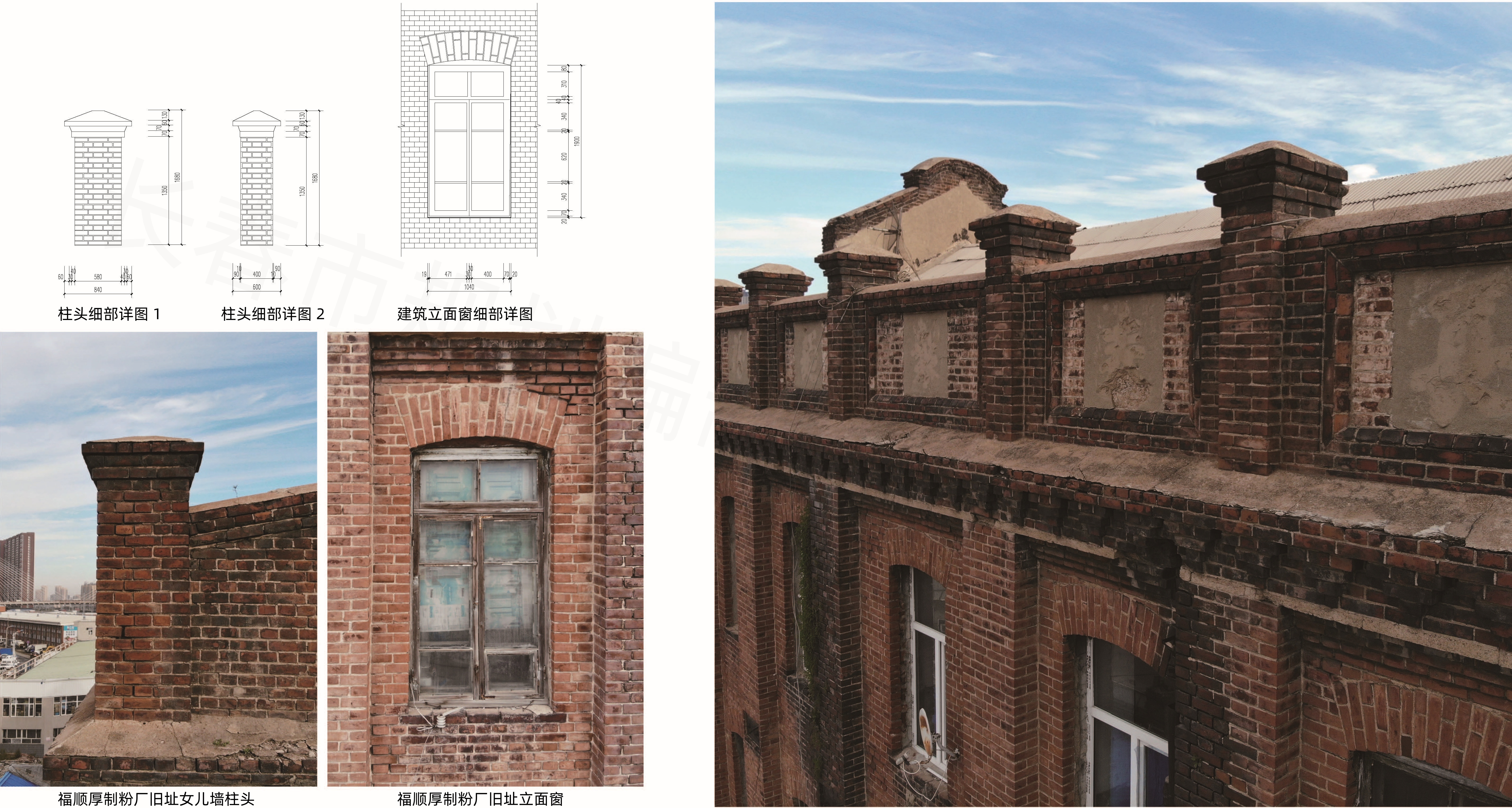该建筑地上四层,砖混结构,总建筑面积1637平方米。建筑平面呈矩形,上覆缓坡红瓦双坡屋顶,外墙采用红砖组砌方式,红砖规格240mmX120mm,采用一顺一丁对缝搭接砌筑。立面通过烟囱进行纵向分割,屋檐以1/4砖厚层层出挑,并于下方砌筑成形似斗拱的装饰构建。立面窗子窄而高,窗洞口上沿采用红砖斜插型砌筑。建筑山墙做成曲线形,具有较强的装饰性。南北方向的女儿墙上有“福顺厚第一制粉厂”的字样。楼顶东、西两端的山墙上刻有“福顺厚”字样。