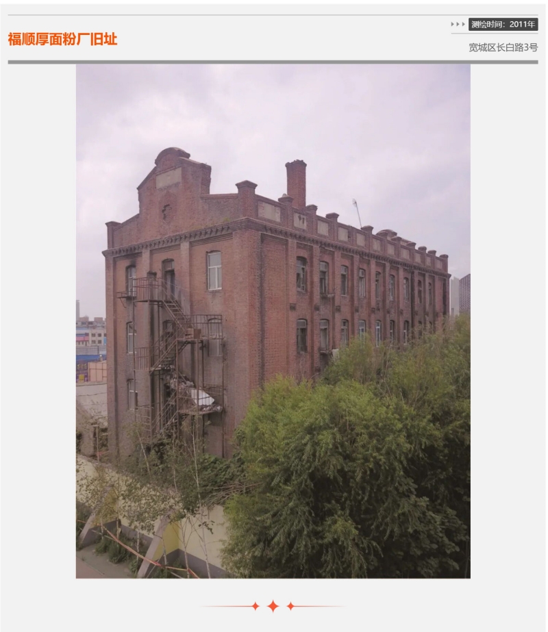 福顺厚面粉厂旧址,位于宽城区长白路3号育新学校中学部西侧,建于1921年。原为双和栈面粉厂,由大连富商郭学纯创办,曾委托给天兴福打理,后天兴福因家族原因关闭,又由福顺厚来经营。天兴福火磨和福顺厚火磨都是当时东北著名的火磨,两楼因为外形相似,仅屋顶顶部一凸一凹区别明显,故被民间称之为“公母楼”。目前该建筑为省级文物保护单位。