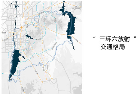 6.提供高效便捷的保障支撑体系:打造“三环六放射”的交通格局,推进公交、慢行系统互转互联;全体系布局普惠性公服设施,推动共建文体、旅游等特色公服设施;协同建设绿色基础设施,推进5G等新型基础设施共建共享,推进市政设施互联互通。