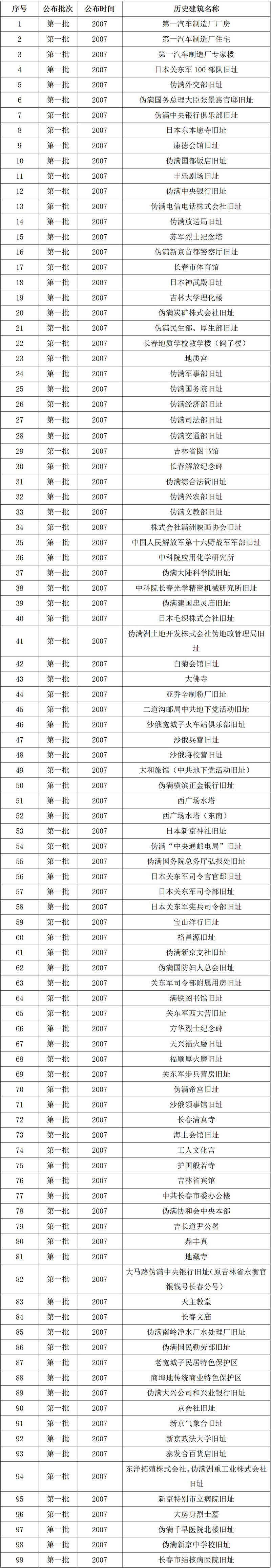 2007年长春市人民政府公布(第一批)历史建筑共 99 处 237 栋。这些建筑都具有独特历史文化内涵,时间跨度主要为19 世纪末至 20 世纪 50 年代,代表了长春市城市建设不同历史时期的典型特征。