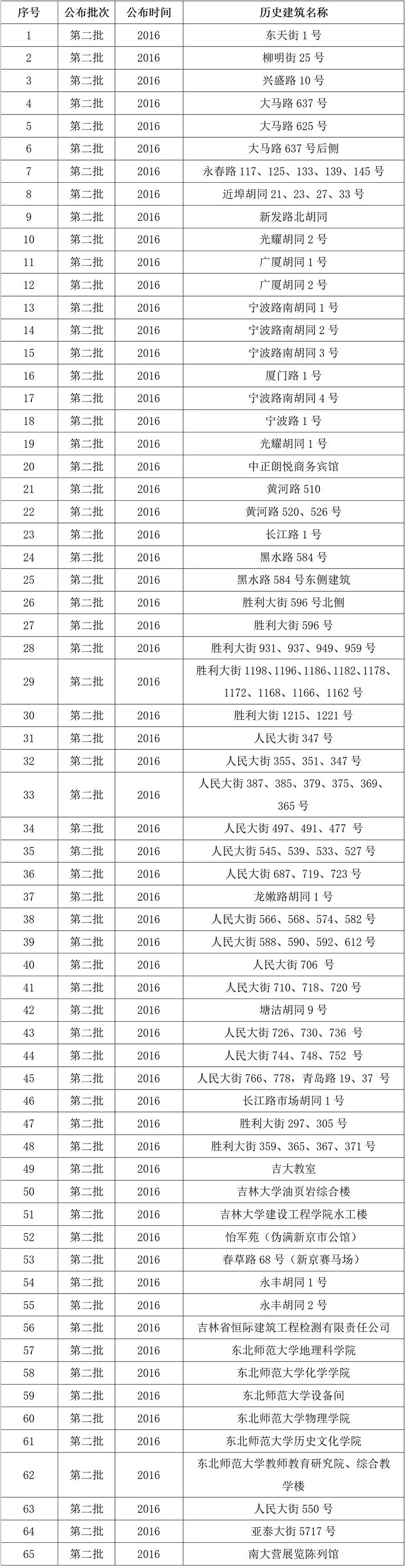 2016年长春市人民政府公布第二批历史建筑共65处65栋。这些建筑建成时间在三十年以上,建筑质量良好、格局完整,具有一定的保护利用价值。建筑风格上,能够反映长春地域建筑历史文化特点,具有一定艺术价值和科研价值。建筑样式、结构和材料上,能够判断出其建造年代以及当时的自然环境特点。施工工艺和工程技术上,能够反映传统民居营造的方法特色和建筑相关技术工艺发展,见证了长春近现代历史发展进程。建筑类型上,包含了有代表性的作坊、商铺、厂房和仓库等。
