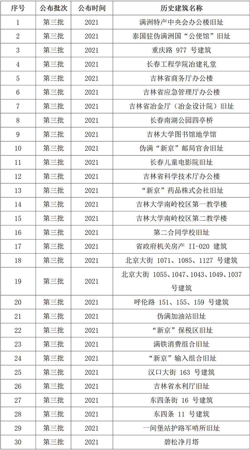 2021年长春市人民政府公布第三批历史建筑共30处35栋。这些建筑具有多元化的建筑功能,突出表达了新中国特色和建设成就,增强了历史城区和历史街区保护要素的完整性。