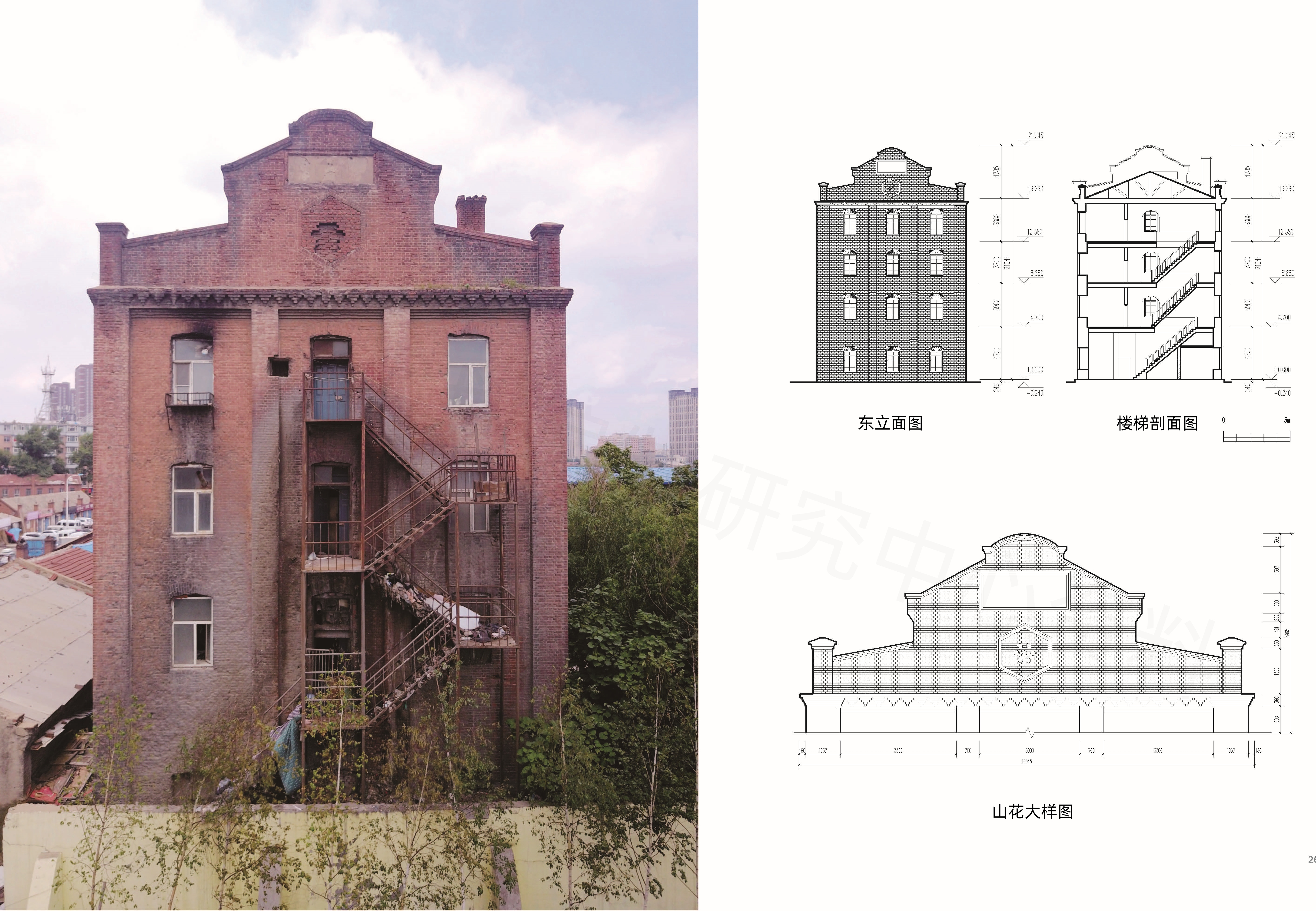 目前该建筑立面风貌保存较为完整,建筑内部空间分隔混乱,缺乏维护。建议对该建筑周围环境进行清理,提升完善基础设施,对于建筑的局部破损和建筑细部的丢失进行保护性修复。