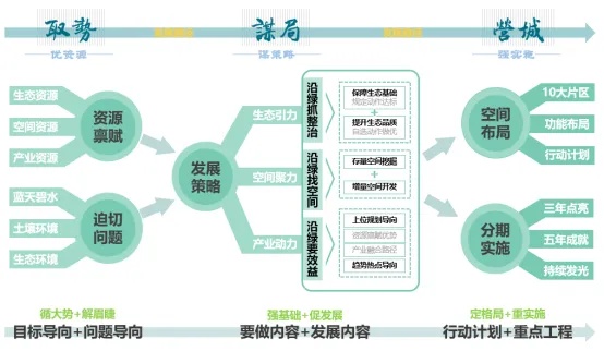 基于生态资源禀赋优势,应对生态品质、生态系统、生态效益三方面问题,提出三大策略,打造“三区”目标。以“生态+”发展为理念,依托“蓝绿空间”基底,形成“生态骨架”,做美生态基底、构建生态系统、挖掘发展空间、嵌入产业动能、完善基础设施,以“十大行动计划”、“百余个行动项目”明确生态强区发展施工图,实现生态强区发展目标。