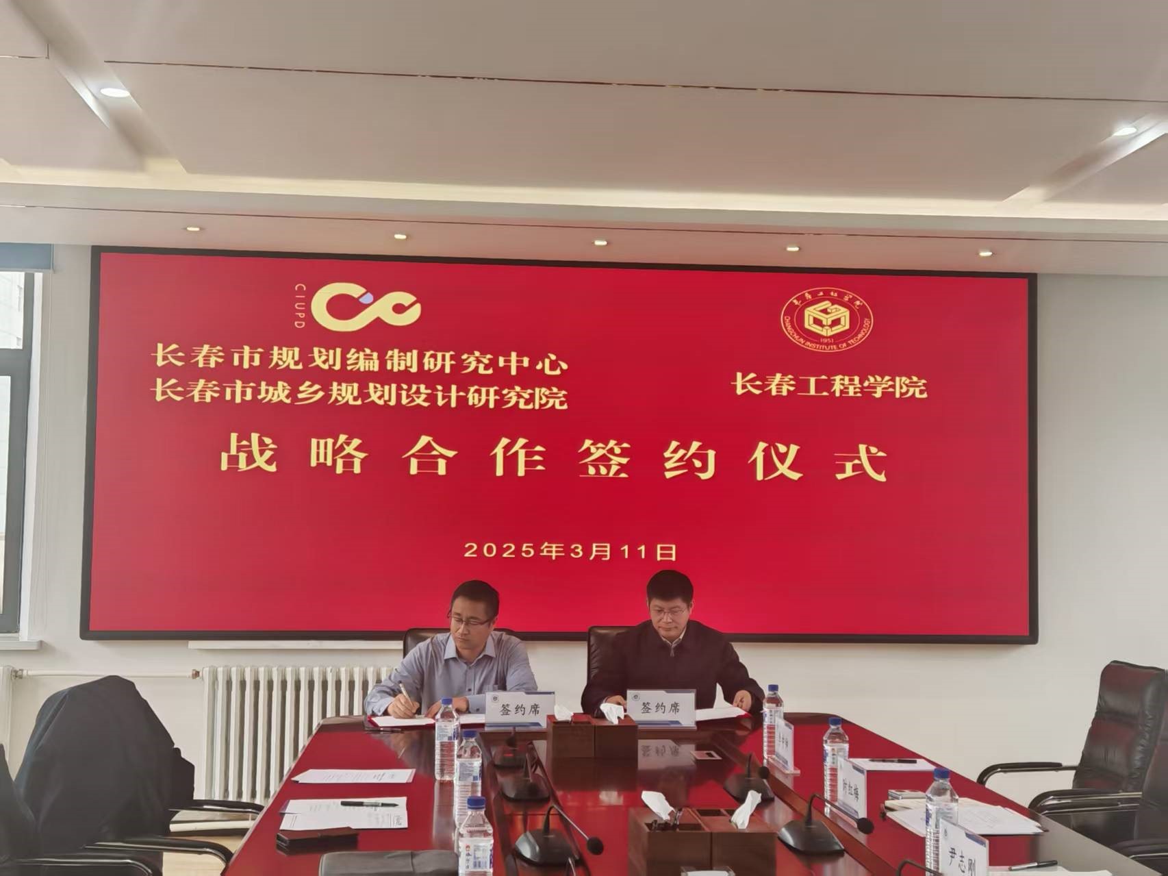 2025年3月11日上午,长春市规划编制研究中心与长春工程学院战略合作签约仪式在长春工程学院湖西校区隆重举行。签约仪式由长春工程学院科学研究处处长张以晨主持,市编研中心主任刘延松、长春工程学院副校长尹志刚分别致辞并代表双方签署协议。